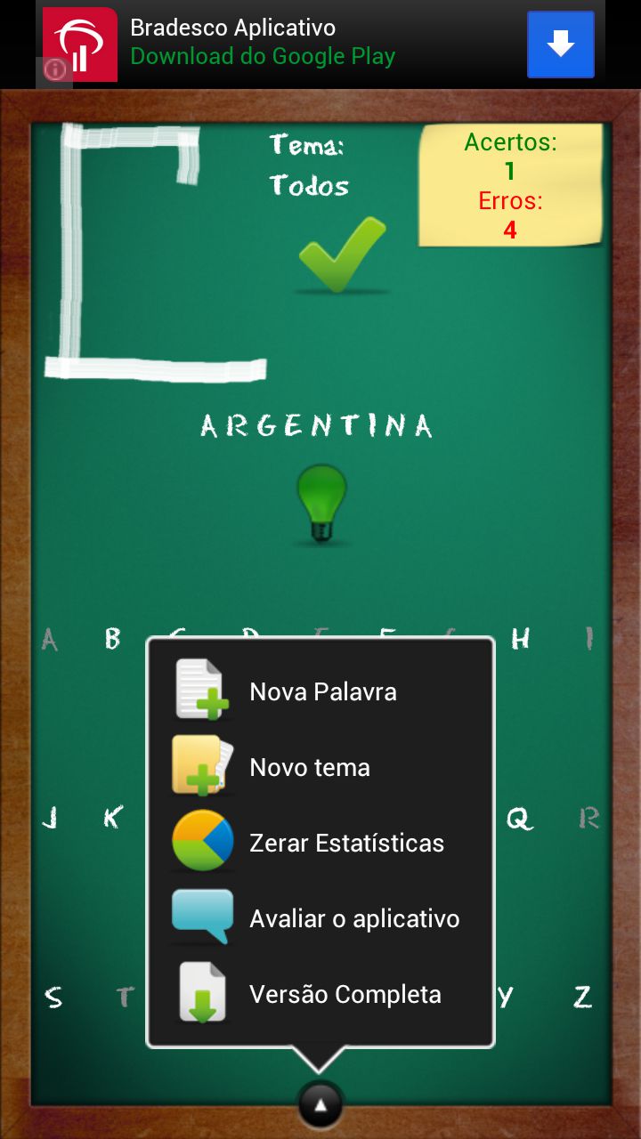 Ao errar ou acertar a palavra podemos escolher uma nova palavra no mesmo tema, mudar de tema e até zera as estatísticas de erros e acertos.