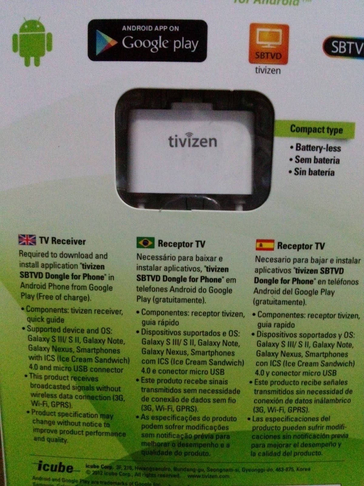 Algo importante a se notar sobre o Tivizen SBTVD Dongle for Android é que o dispositivo só funciona em aparelho com o sistema Android 4.0 ou superior e com USB Micro que tenham suporte para USB On-the-go (OTG) se o aparelho não tiver esses requisitos o aparelho não irá funcionar.